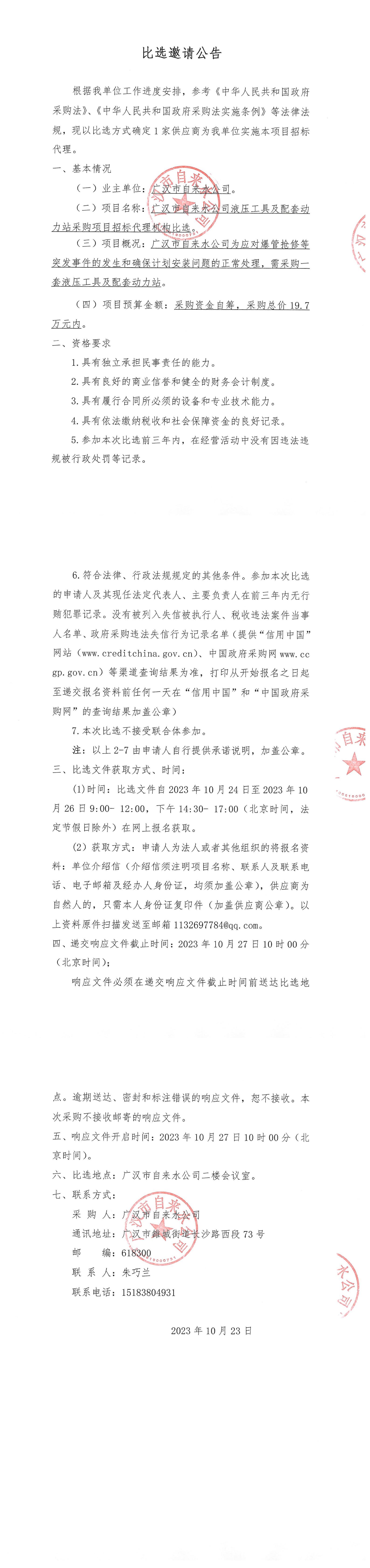 液壓工具及配套動力站采購項(xiàng)目招標(biāo)代理機(jī)構(gòu)比選邀請公告