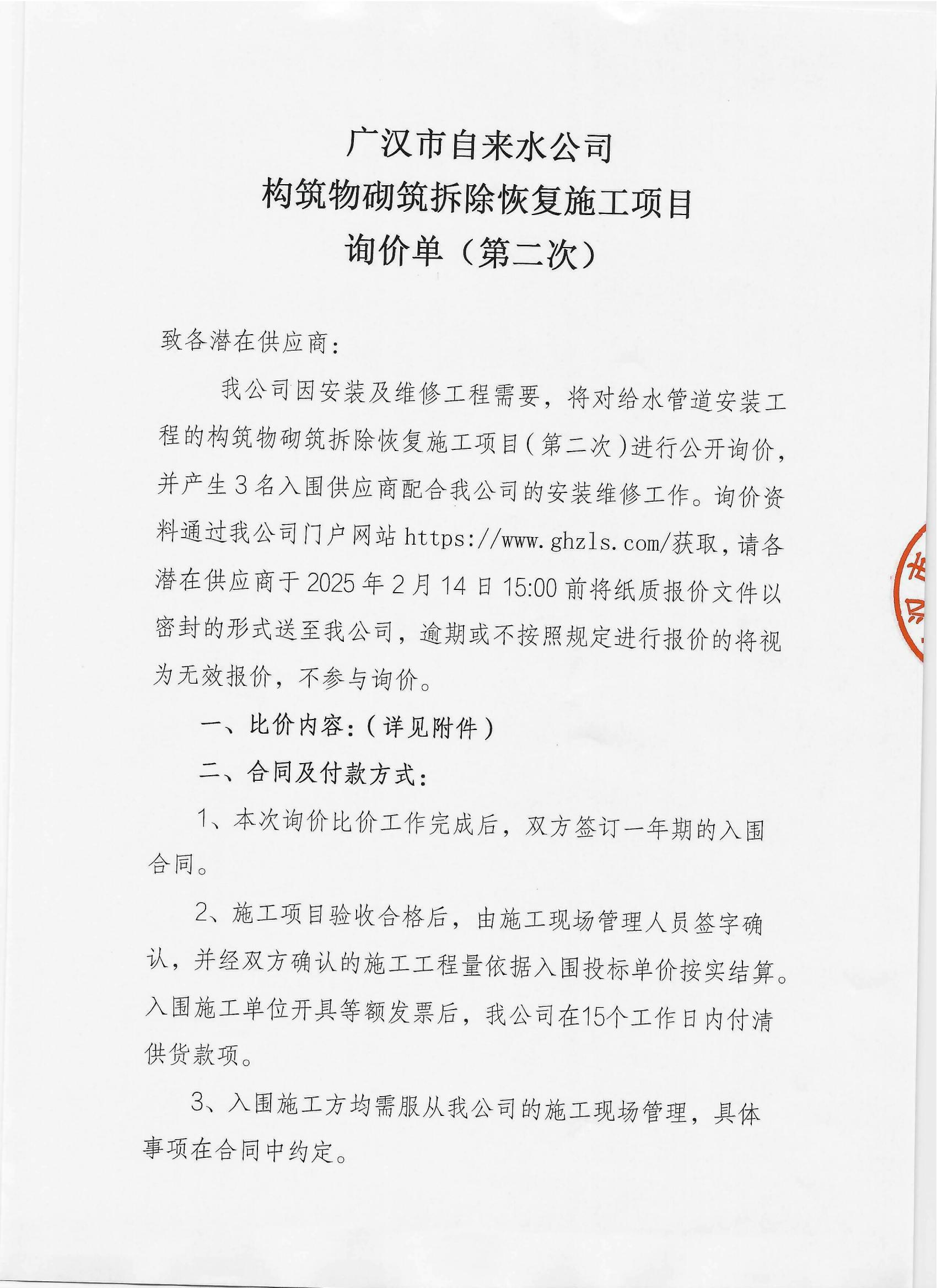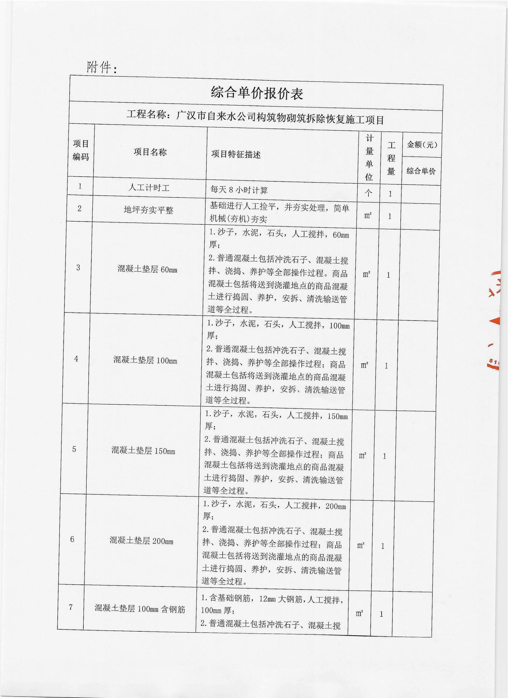 廣漢市自來水公司構筑物砌筑拆除恢復施工項目詢價單(第二次)