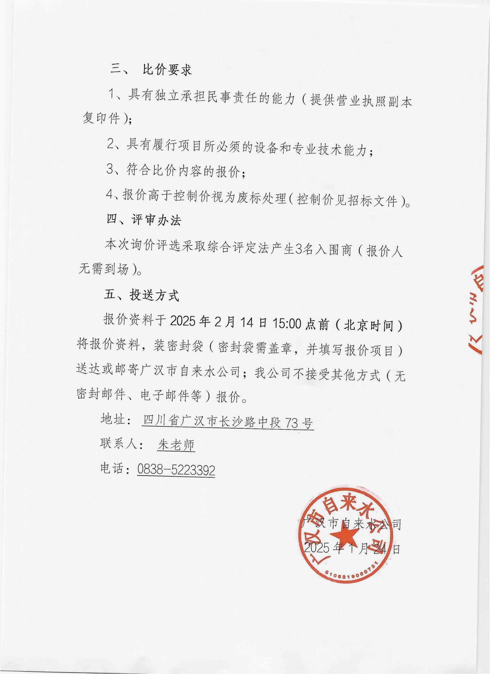 廣漢市自來水公司關于采購廣漢市自來水廠活性炭項目的詢價函
