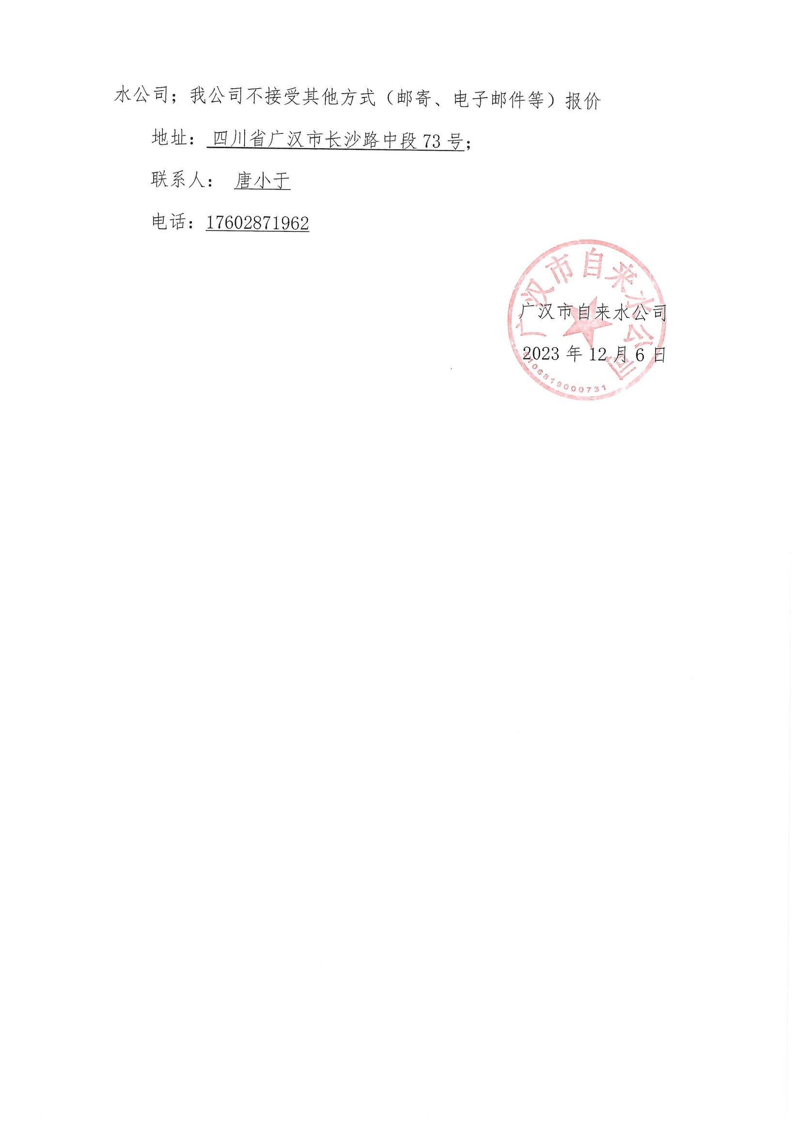 廣漢市自來水公司關(guān)于采購廣漢市自來水廠活性炭項目的詢價函