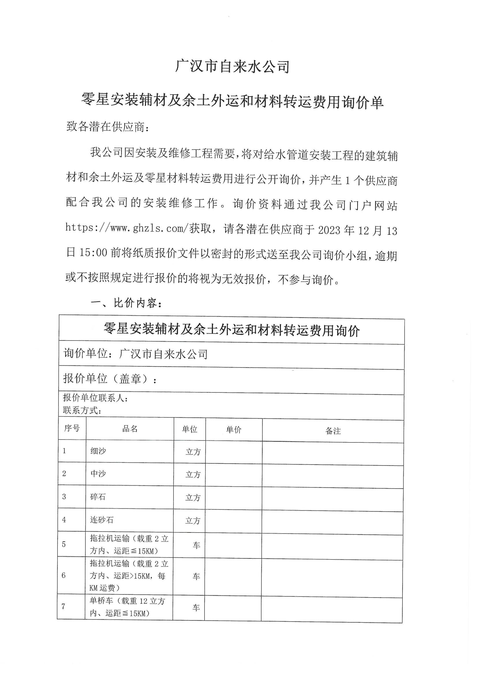 零星安裝輔材及余土外運和材料轉(zhuǎn)運費用詢價單