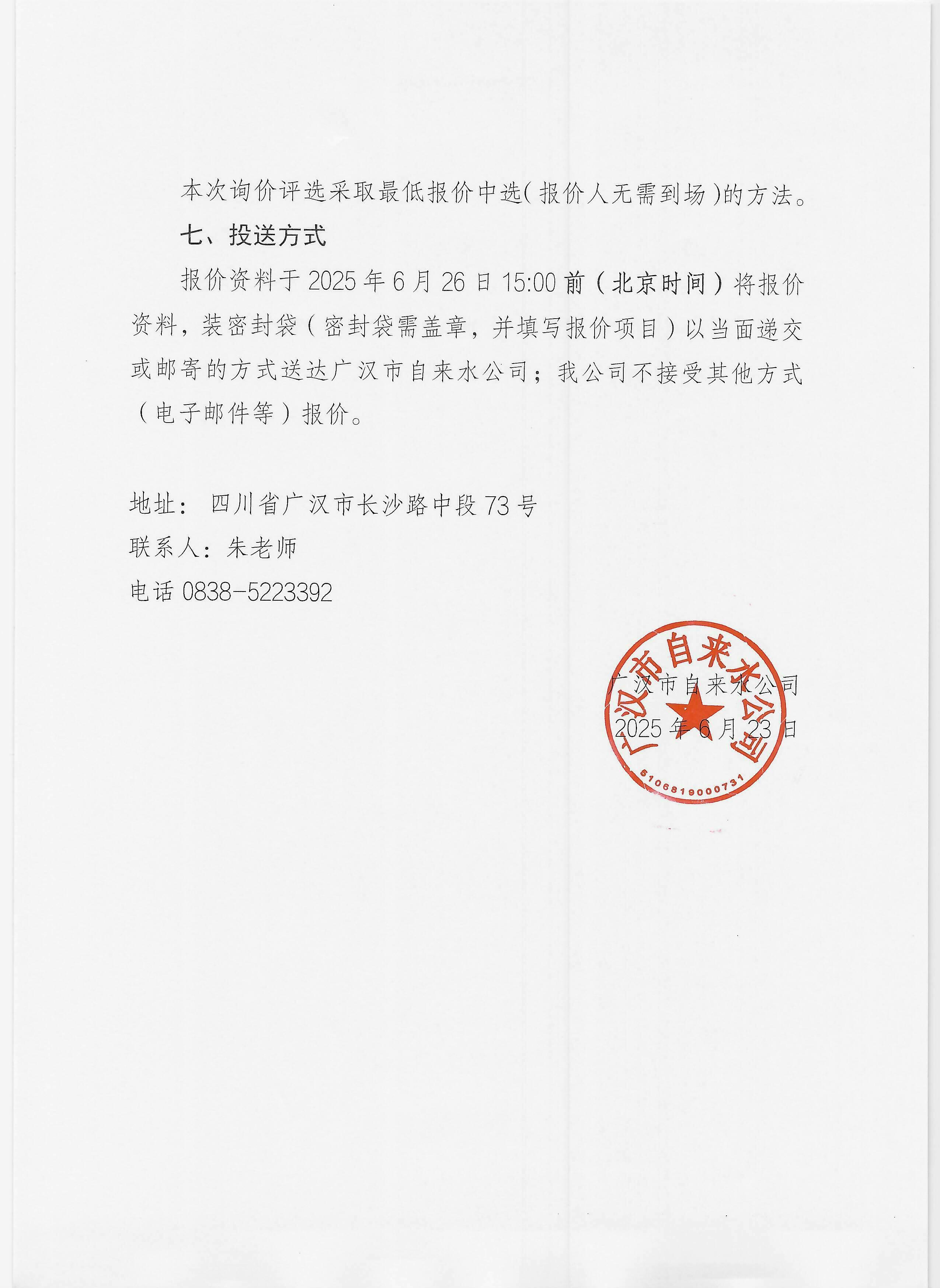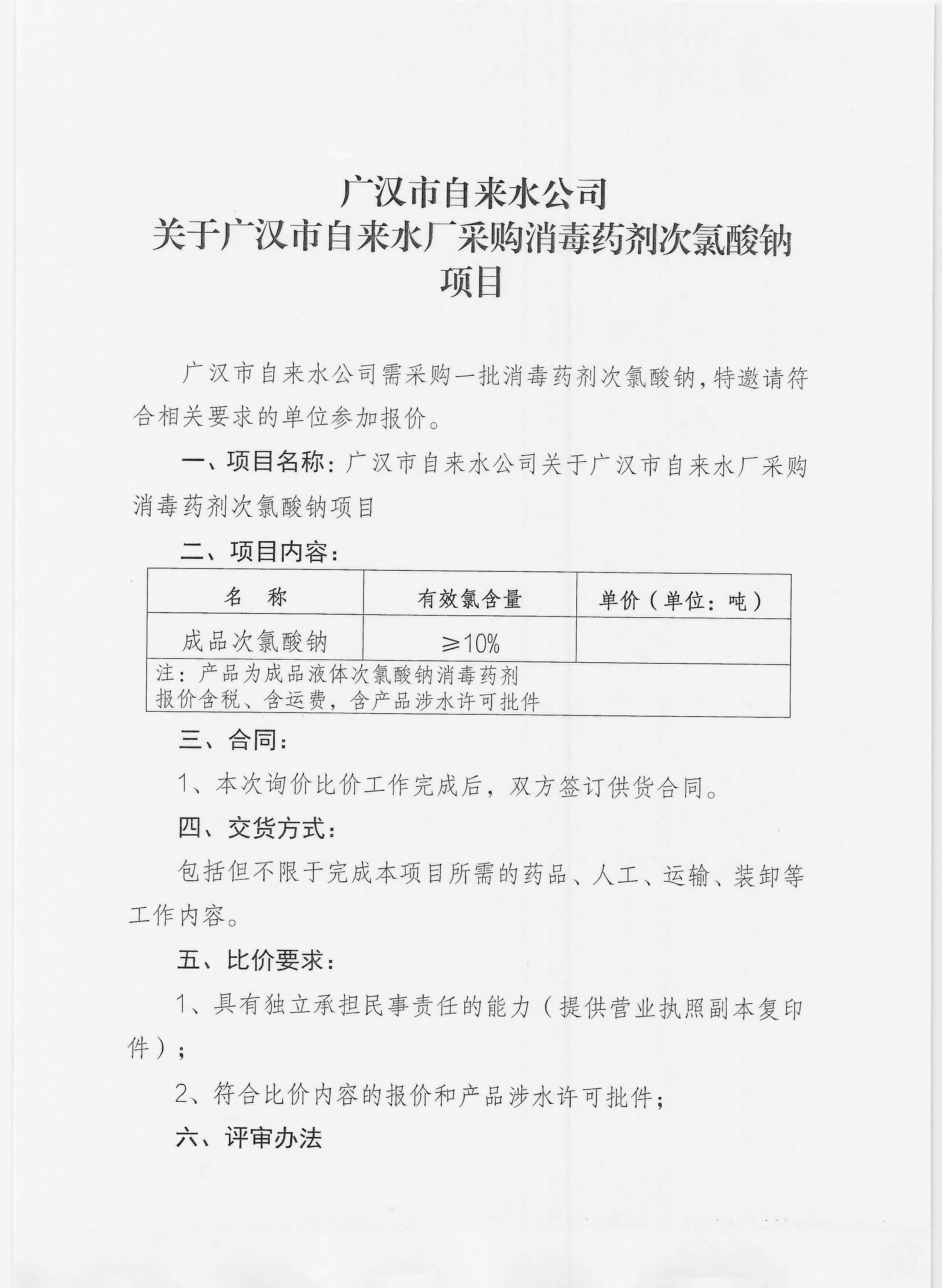 廣漢市自來水公司關(guān)于廣漢市自來水廠采購消毒藥劑次氯酸鈉項目