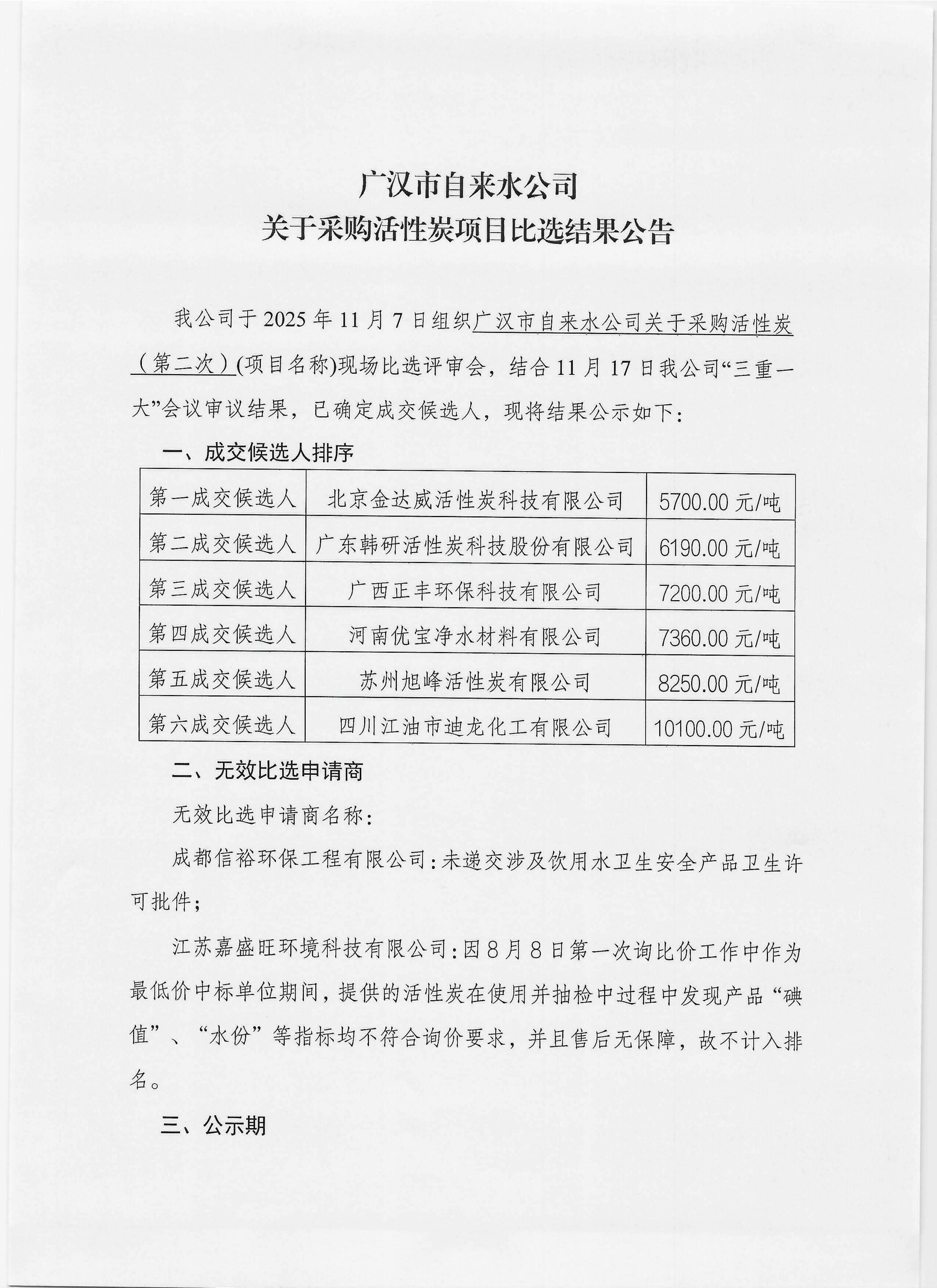 關(guān)于采購活性炭項(xiàng)目比選結(jié)果公告