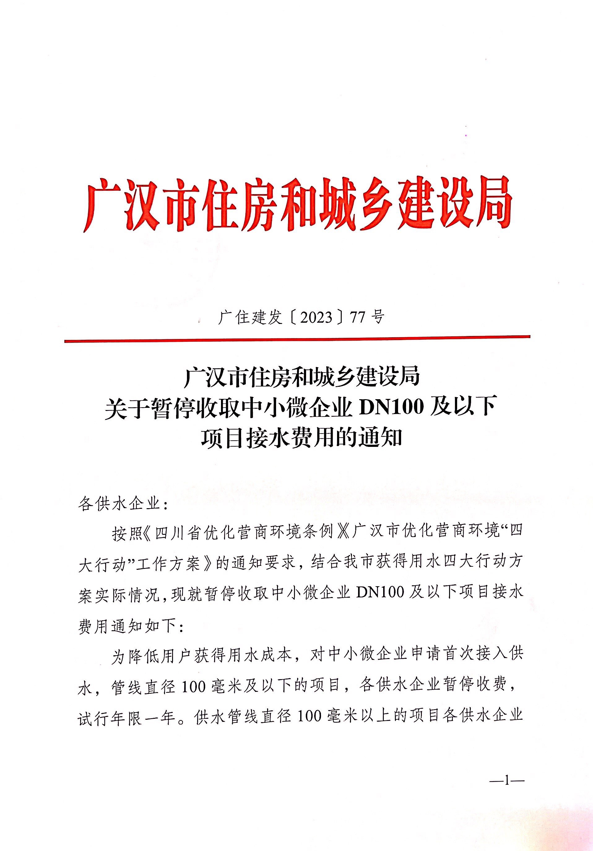 關(guān)于暫停收取中小微企業(yè)DN100 及以下項(xiàng)目接水費(fèi)用的通知